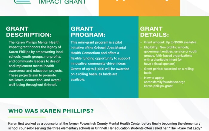 March 4, 2026 We’re honored to announce the Karen Phillips Mental Health Impact Grant, offered by the Grinnell Area Mental Health Consortium. Created in memory of Karen Phillips—a school counselor and founding member of [...]